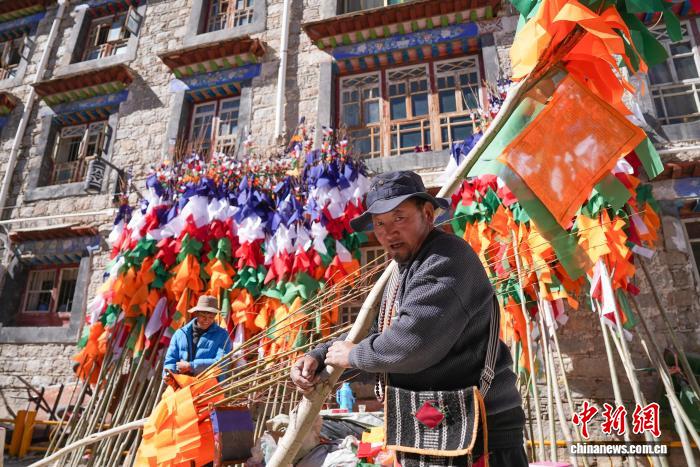 圖為來自仁布縣的格桑扎西扛著五彩經(jīng)幡樹。貢確 攝