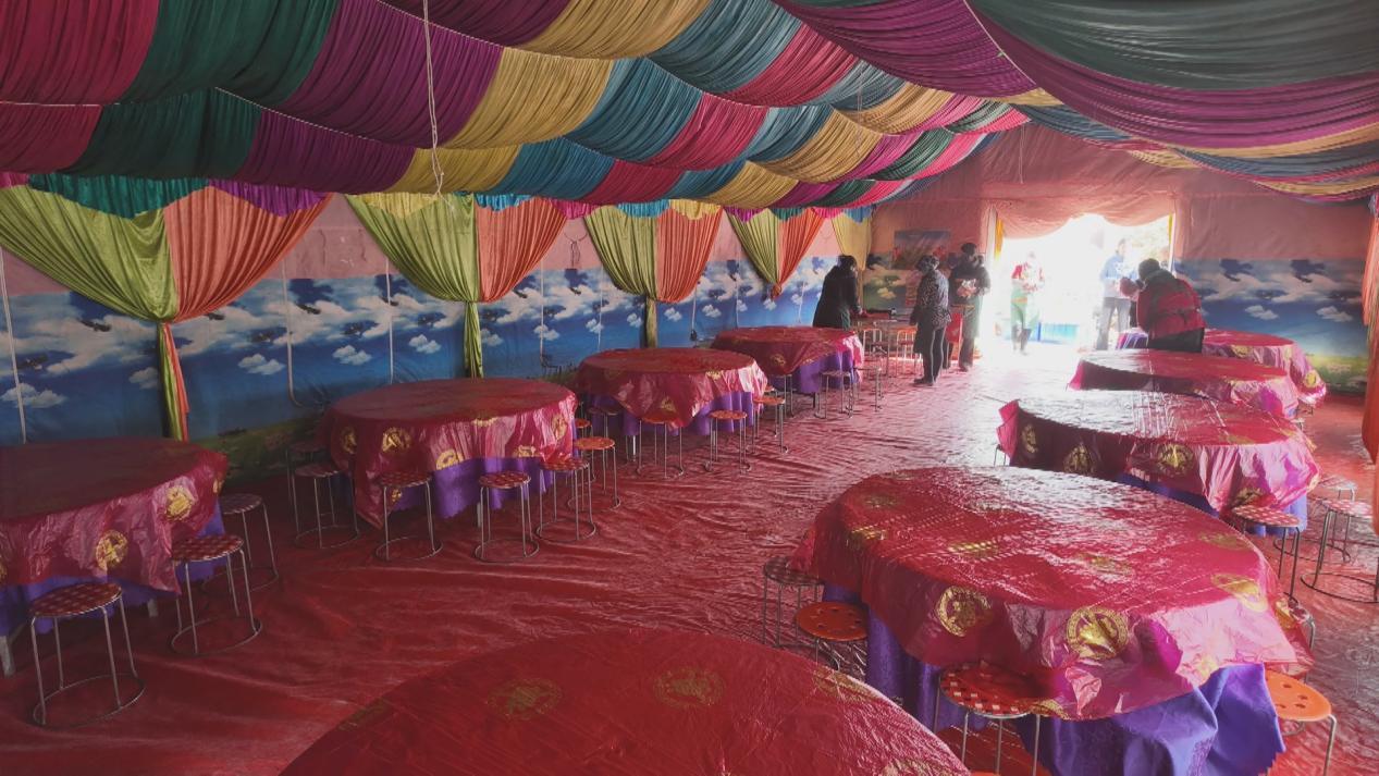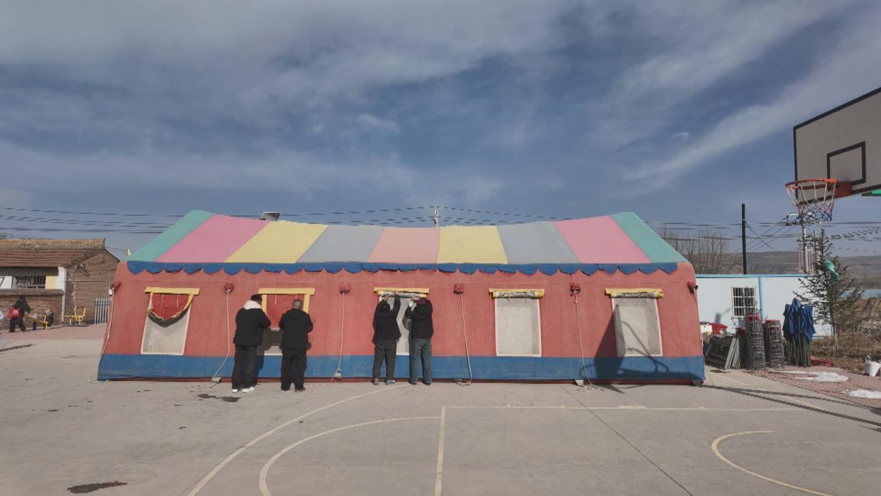 大家一起動手,不到半小時,一個大約一百平方米的移動帳篷宴會廳平地而起,配套的桌椅、桌布、取暖設(shè)備和照明電燈等一樣不少。鍋灶、煤氣爐、蒸箱一字排開,就在帳篷門口,真正“明廚亮灶”。備好了大件,大家開始洗青菜、擇菜,這些當天現(xiàn)弄才新鮮。