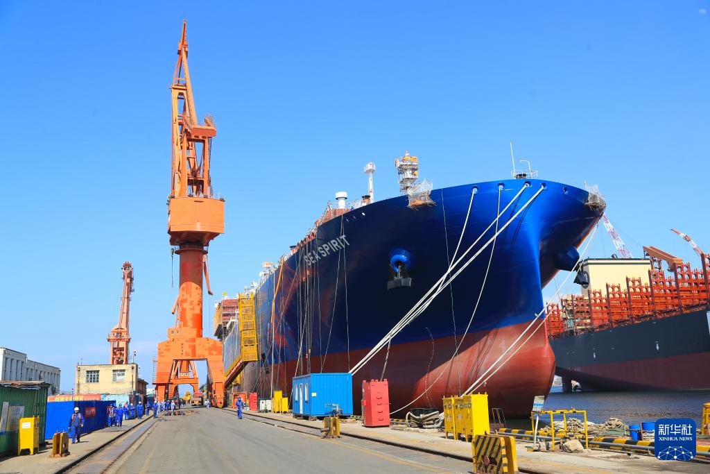 在中國船舶集團(tuán)大連船舶重工集團(tuán)有限公司拍攝的正在建造的大型液化天然氣(LNG)運(yùn)輸船(2024年6月15日攝)。