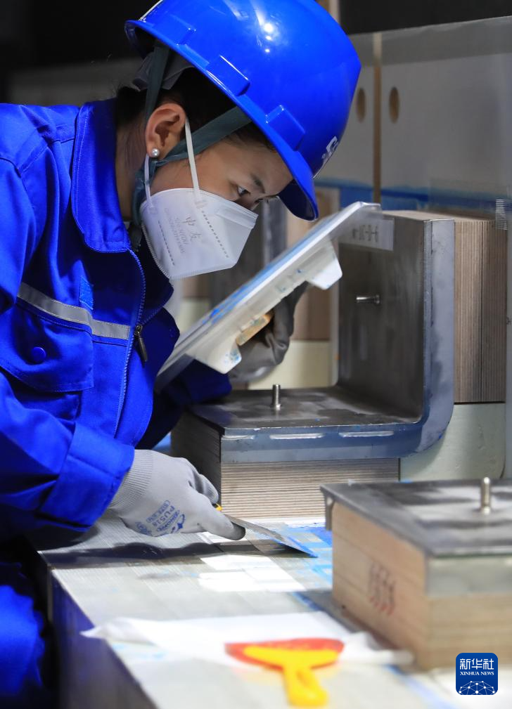 在中國船舶集團(tuán)大連船舶重工集團(tuán)有限公司LNG綜合培訓(xùn)中心,一名學(xué)員在練習(xí)次屏壁手工粘連作業(yè)(2024年6月15日攝)。