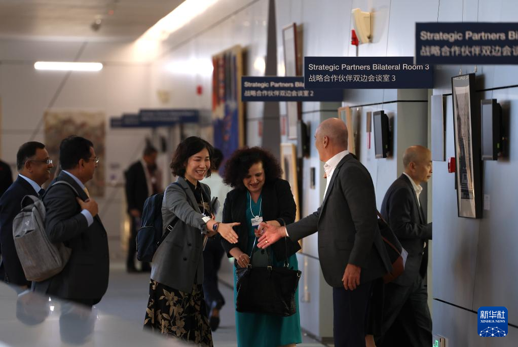 幾名嘉賓在夏季達(dá)沃斯論壇主會場大連國際會議中心洽談室外握手(2024年6月26日攝)。