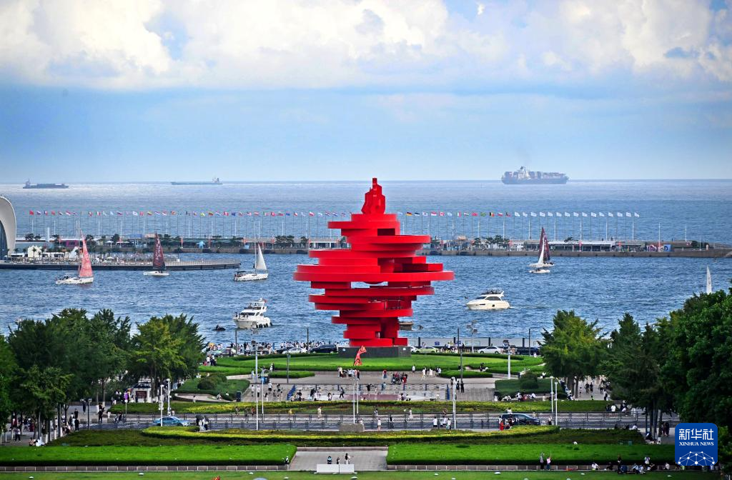 從五四廣場遠眺青島奧林匹克帆船中心(8月19日攝)。