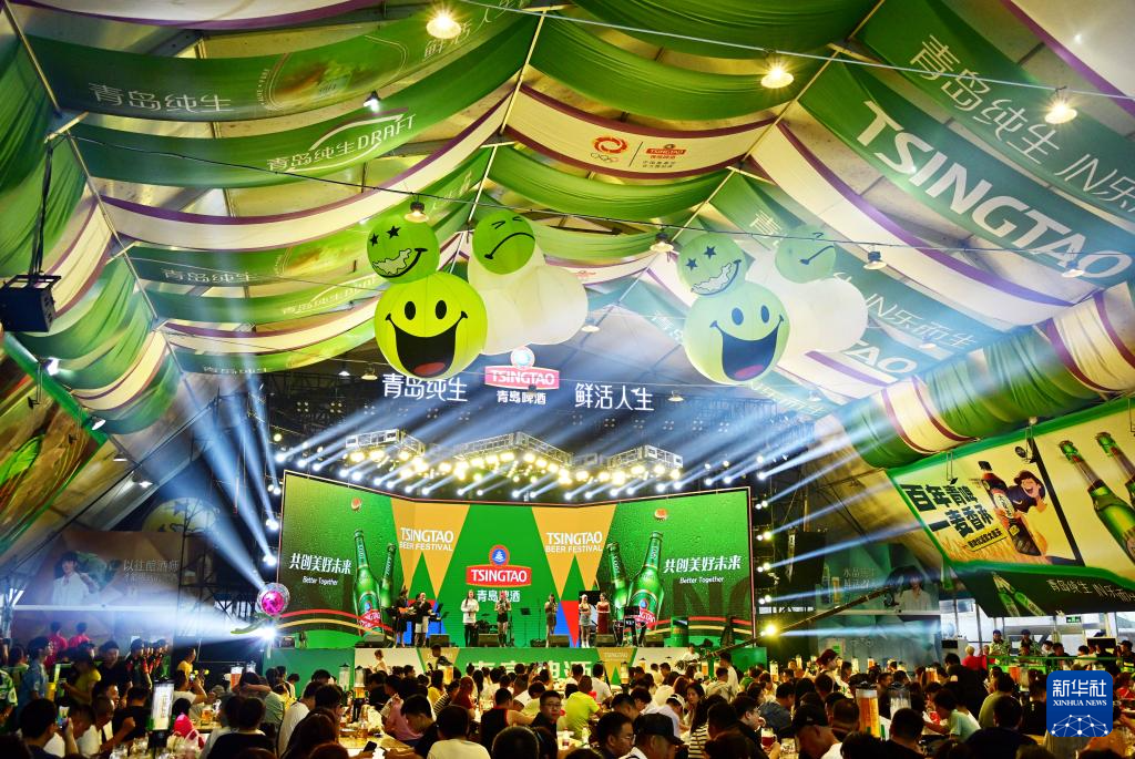 人們在第34屆青島國際啤酒節(jié)青島西海岸新區(qū)金沙灘啤酒城內(nèi)消費(7月19日攝)。