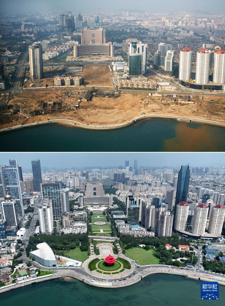這是一張拼版照片。上圖為1996年拍攝的建設(shè)中的青島五四廣場(青島市委宣傳部供圖),下圖為鳥瞰青島五四廣場景色(8月17日新華社記者李紫恒攝,無人機照片)。