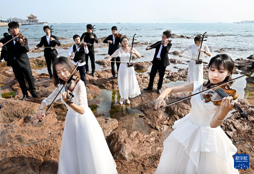 中國海洋大學(xué)藝術(shù)系學(xué)生在青島市市南區(qū)棧橋景區(qū)演奏(4月18日攝)。