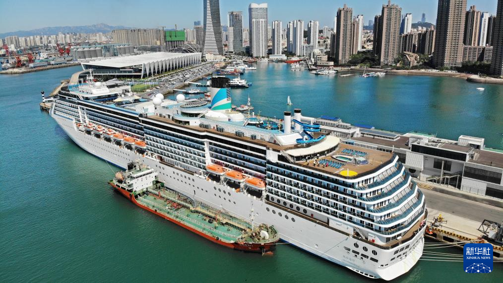 巴哈馬籍“愛達·地中海”號郵輪靠泊山東青島國際郵輪母港(6月27日攝,無人機照片)。