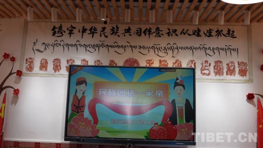 在西藏日喀則市拉孜縣第二幼兒園中(1)班教室里,老師郁瓊珠姆話音剛落,孩子們的回答便齊聲響起,清脆而堅(jiān)定。屏幕上,56個(gè)民族的卡通形象匯聚于一幅畫(huà)之中。她接著問(wèn)道:“那我們國(guó)家遼闊的土地上,生活著多少個(gè)民族?”一只只小手高高舉起,搶答聲此起彼伏:“56個(gè)!”對(duì)孩子們而言,這些答案已經(jīng)成為日常學(xué)習(xí)生活中耳濡目染的常識(shí)。