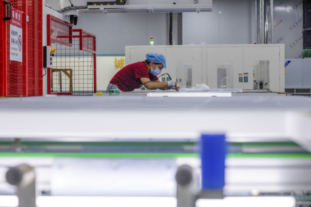 9月22日,工人在新疆巴音郭楞蒙古自治州若羌縣的國晟企誠新能源有限公司生產(chǎn)光伏電池片。