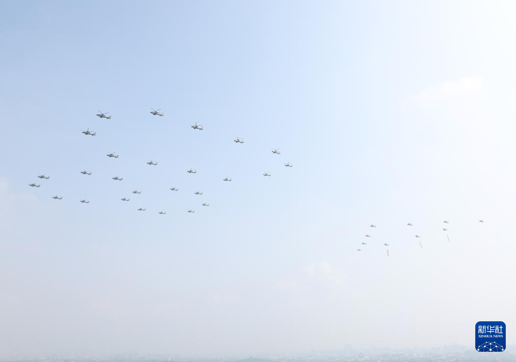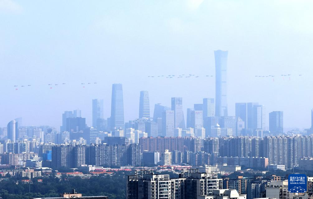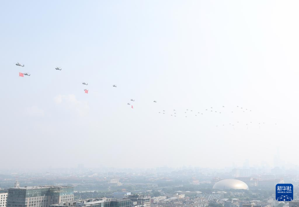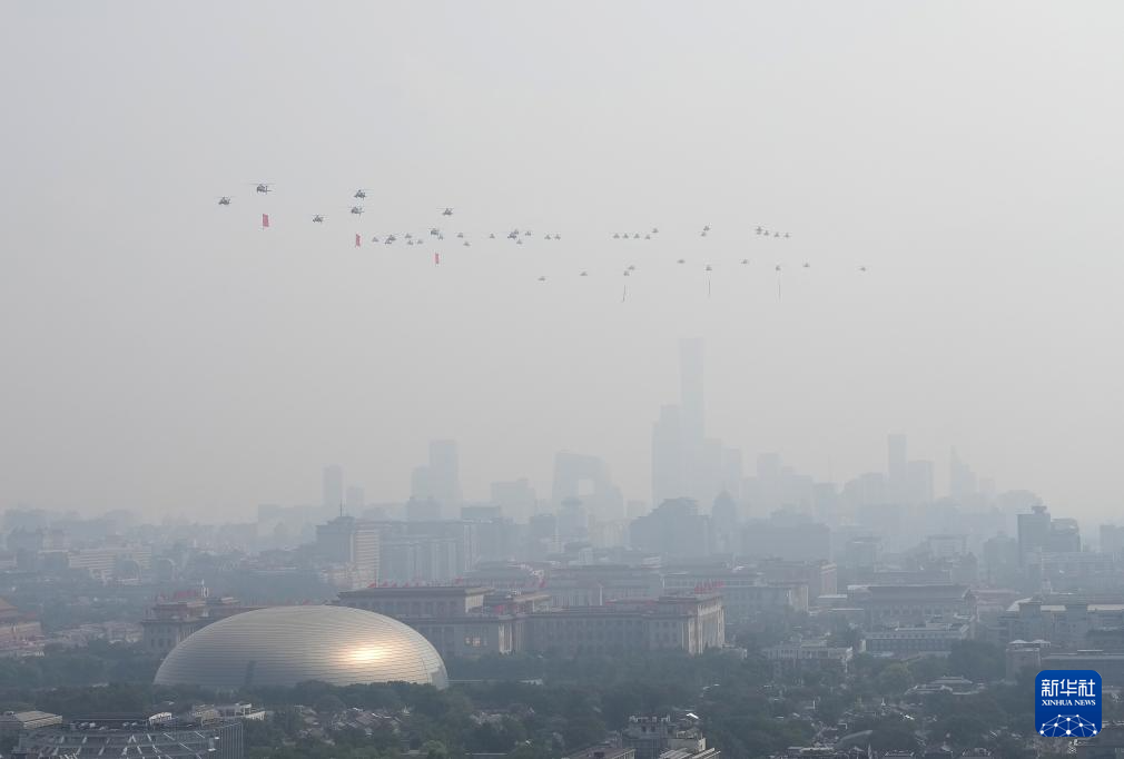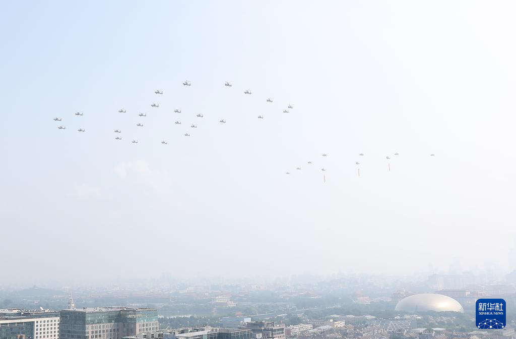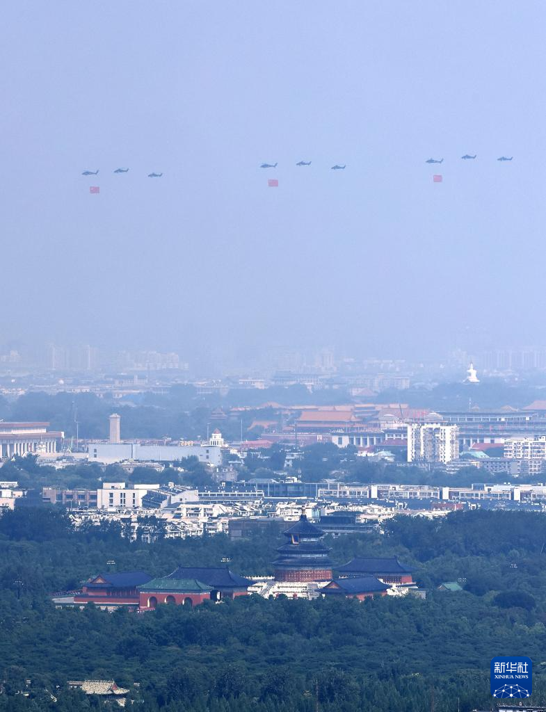 9月3日,紀(jì)念中國(guó)人民抗日戰(zhàn)爭(zhēng)暨世界反法西斯戰(zhàn)爭(zhēng)勝利80周年大會(huì)在北京隆重舉行。這是空中護(hù)旗梯隊(duì)。