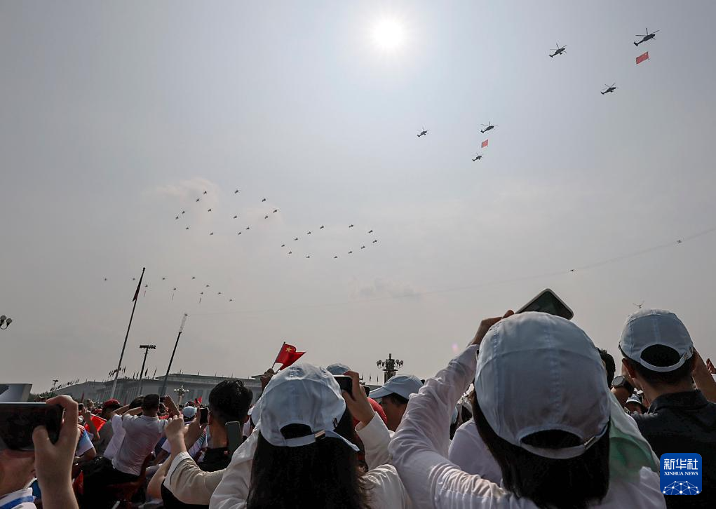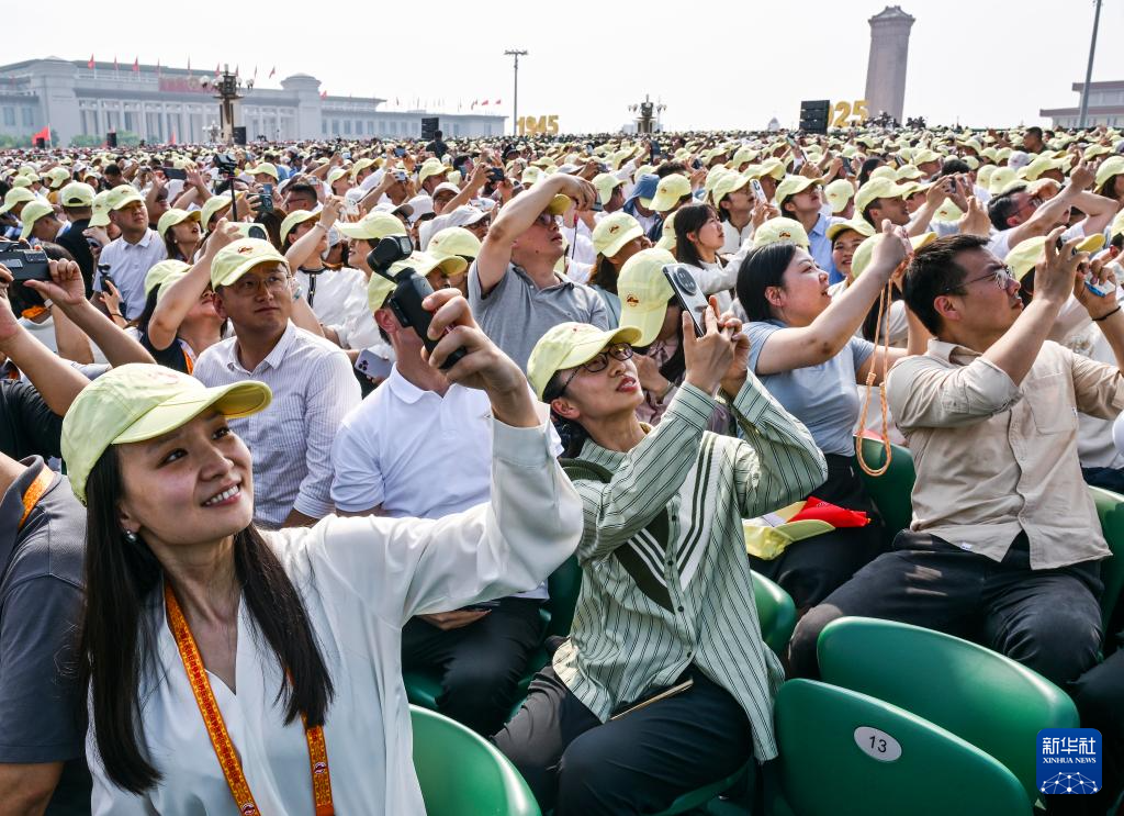 9月3日,紀(jì)念中國(guó)人民抗日戰(zhàn)爭(zhēng)暨世界反法西斯戰(zhàn)爭(zhēng)勝利80周年大會(huì)在北京隆重舉行。這是觀眾拍攝空中護(hù)旗梯隊(duì)通過(guò)天安門廣場(chǎng)。