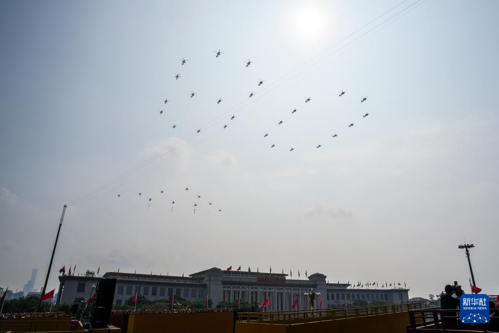 9月3日,紀(jì)念中國(guó)人民抗日戰(zhàn)爭(zhēng)暨世界反法西斯戰(zhàn)爭(zhēng)勝利80周年大會(huì)在北京隆重舉行。這是空中護(hù)旗梯隊(duì)通過(guò)天安門廣場(chǎng)。