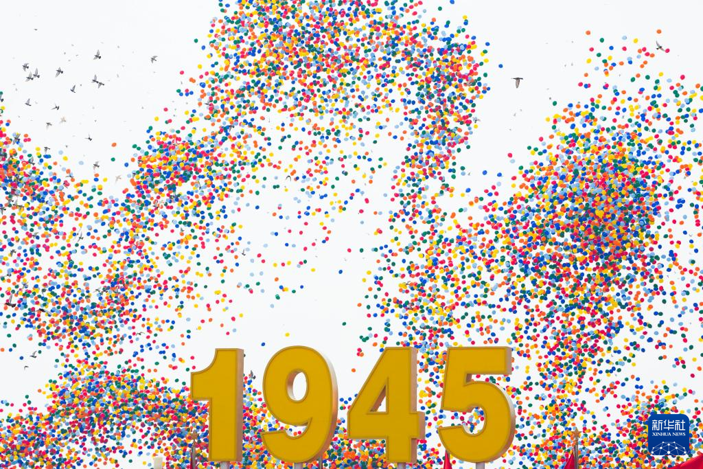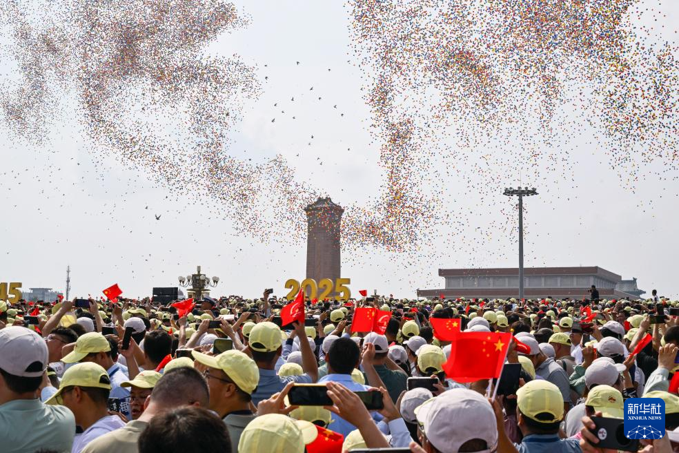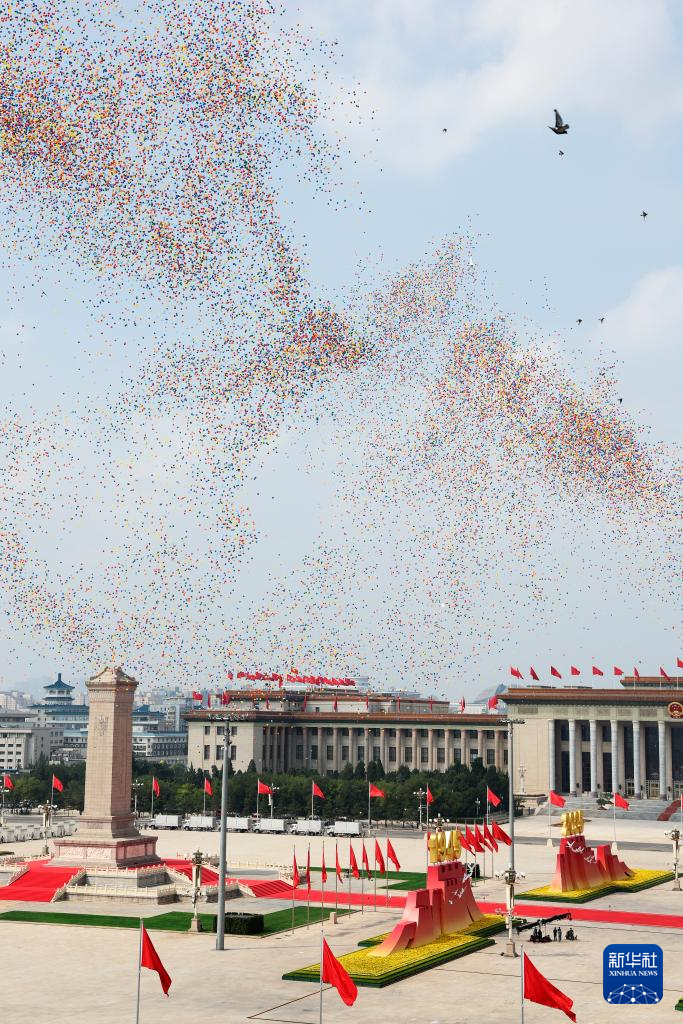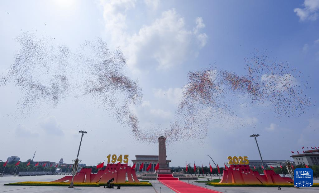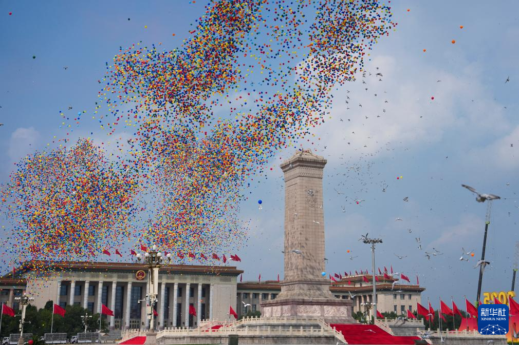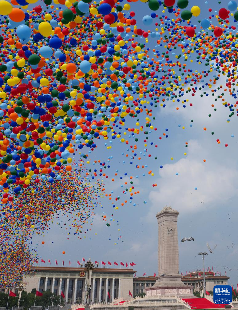 9月3日,紀(jì)念中國人民抗日戰(zhàn)爭暨世界反法西斯戰(zhàn)爭勝利80周年大會在北京隆重舉行。這是紀(jì)念大會現(xiàn)場放飛氣球。