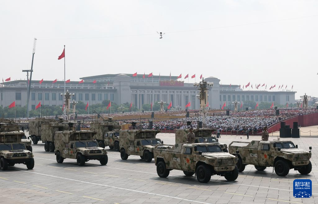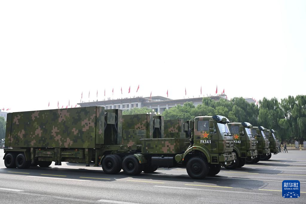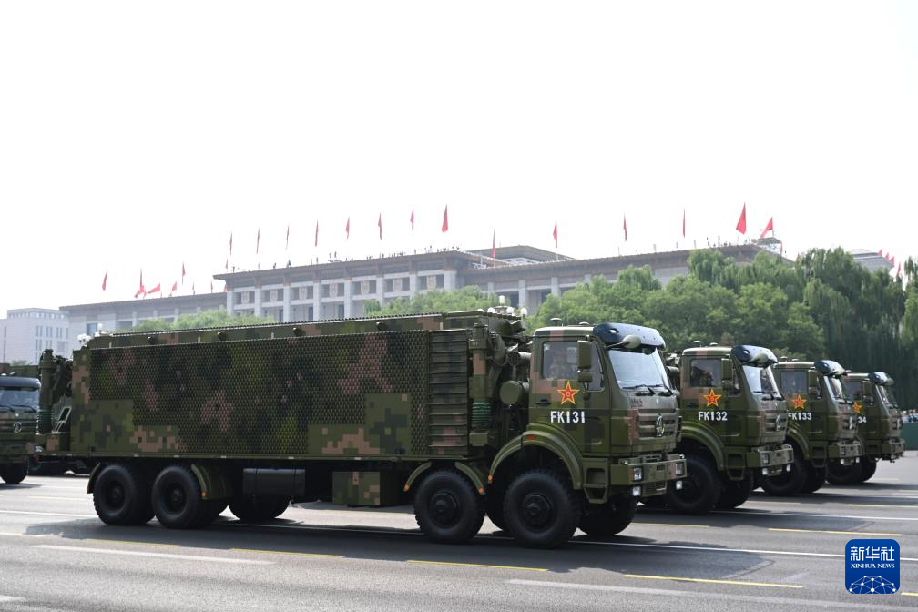 9月3日,紀(jì)念中國人民抗日戰(zhàn)爭暨世界反法西斯戰(zhàn)爭勝利80周年大會在北京隆重舉行。這是信息支援方隊通過天安門廣場。