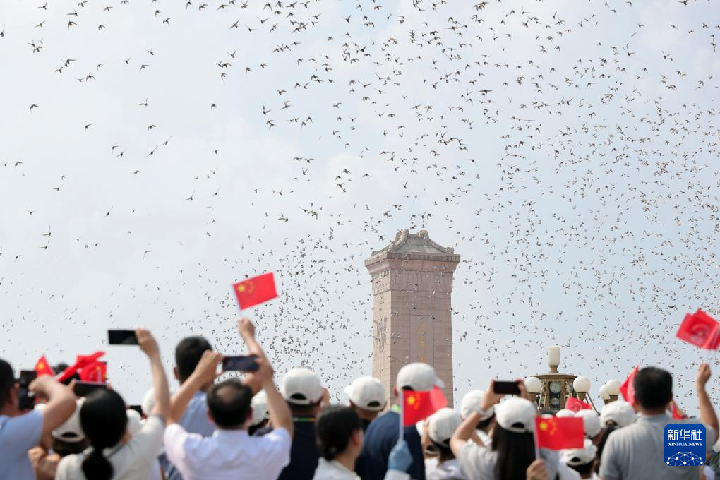 9月3日,紀(jì)念中國人民抗日戰(zhàn)爭暨世界反法西斯戰(zhàn)爭勝利80周年大會在北京隆重舉行。這是紀(jì)念大會現(xiàn)場放飛鴿子。