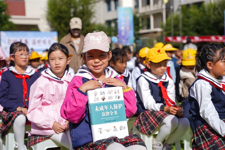 西藏自治區(qū)2025年“送法進(jìn)校園”系列普法宣傳示范活動(dòng)中,孩子們領(lǐng)到《未成年人保護(hù)法律全書(shū)》。記者 貢曲羅杰 攝