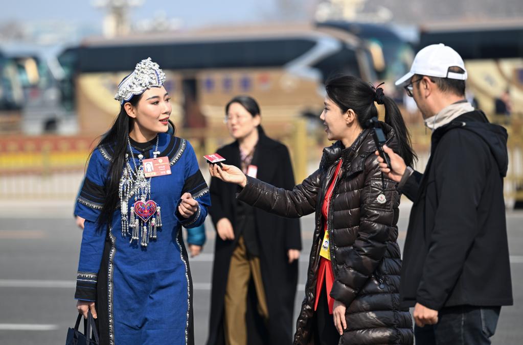 3月8日,全國(guó)政協(xié)十四屆四次會(huì)議在北京人民大會(huì)堂舉行第三次全體會(huì)議。這是記者在采訪全國(guó)政協(xié)委員。新華社記者 李賀 攝