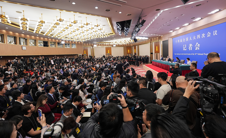 3月8日,十四屆全國(guó)人大四次會(huì)議在北京梅地亞中心新聞發(fā)布廳舉行記者會(huì)。中共中央政治局委員、外交部長(zhǎng)王毅就中國(guó)外交政策和對(duì)外關(guān)系回答中外記者提問。這是記者在提問。新華社記者 王曦 攝